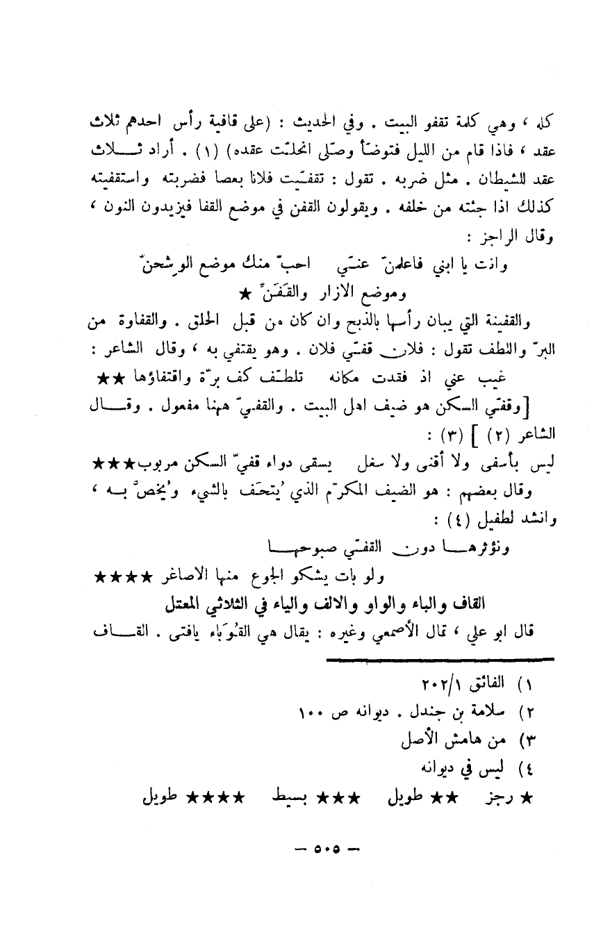 كله، وهي كلمة تقفو البيت. وفي الحديث: (على قافية رأس أحدهم ثلاث عقد، فإذا قام من الليل فتوضّأ وصلّى انحلّت عقده). أراد ثلاث عقد للشيطان. مثل ضربه. تقول: تقفّيت فلانا بعصا فضربته واستقفيته كذلك إذا جئته من خلفه. ويقولون القفن في موضع القفا فيزيدون النون، وقال الراجز: