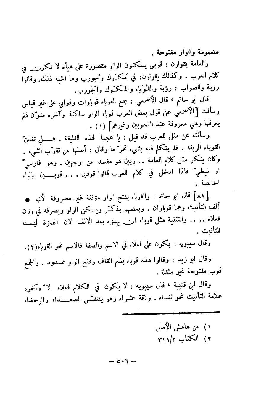وسألته عن مثل للعرب قد قيل: يا عجبا لهذه الفليقة. هل تغلبنّ القوباء الريقة. فلم يتكلم فيه بشيء تحرّجا وقال: أصلها من تقوّب الشيء. وكان ينكر مثل كلام العامة .. ربين هو مفسد من وجهين. وهو فارسيّ أو نبطيّ فإذا أدخل في كلام العرب قالوا قوفين ... قوبين بالباء الخالصة.