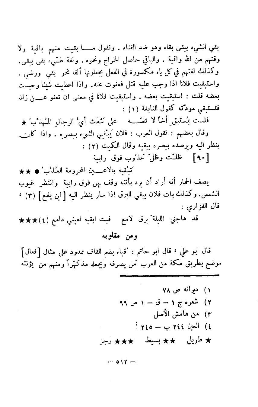 بقي الشيء يبقى بقاء وهو ضد الفناء. وتقول ما بقيت منهم باقية ولا وقتهم من الله واقية. والباقي حاصل الخراج ونحوه. ولغة طيّئ بقى يبقى. وكذلك لغتهم في كل ياء مكسورة في الفعل يجعلونها ألفا نحو بقي ورضي. واستبقيت فلانا إذا وجب عليه قتل فعفوت عنه. وإذا أعطيت شيئا وحبست بعضه قلت: استبقيت بعضه. واستبقيت فلانا في معنى أن تعفو عن زلله فتستبقي مودّته كقول النابغة:
