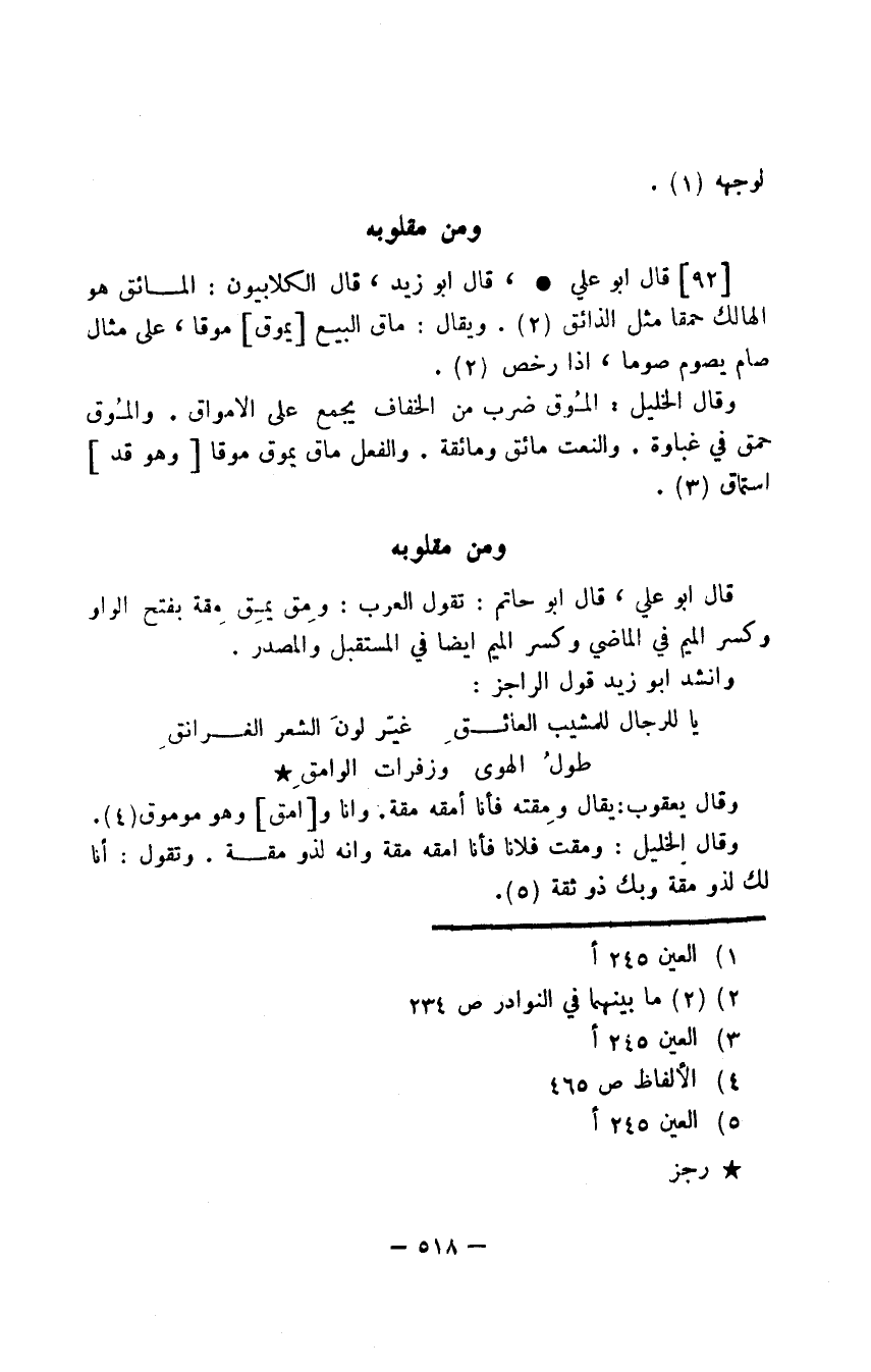 قال أبو علي، قال أبو حاتم: تقول العرب: ومِق يمِق مِقة بفتح الواو وكسر الميم في الماضي وكسر الميم أيضا في المسقبل والمصدر.