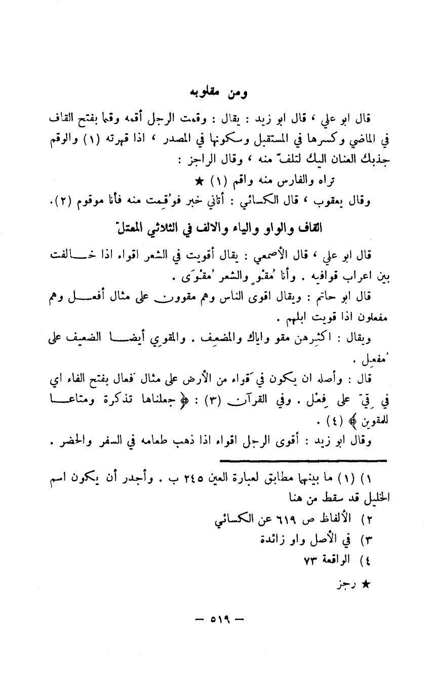 قال أبو حاتم: ويقال أقوى الناس وهم مقوون على مثال أفعل وهم مفعلون إذا قويت إبلهم.