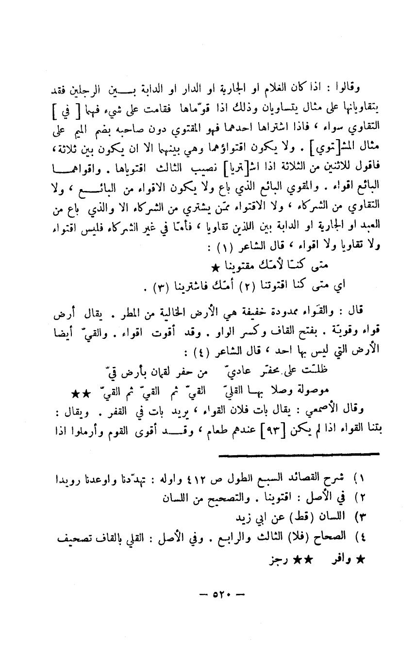 وقالوا: إذا كان الغلام أو الجارية أو الدار أو الدابة بين الرجلين فقد يتقاويانها على مثال يتساويان وذلك إذا قوّماها فقامت على شيء فهما في التقاوي سواء، فإذا اشتراها أحدهما فهو المقتوي دون صاحبه بضم الميم على مثال المشتوي. ولا يكون اقتواؤهما وهي بينهما إلا أن يكون بين ثلاثة، فأقول للاثنين من الثلاثة إذا اشتريا نصيب الثالث اقتوياها. وأقواهما البائع إقواء. والمقوي البائع الذي باع ولا يكون الإقواء من البائع، ولا التقاوي من الشركاء، ولا الاقتواء ممّن يشتري من الشركاء إلا والذي باع من العبد أو الجارية أو الدابة بين اللذين تقاويا، فأما في غير الشركاء فليس اقتواء ولا تقاويا ولا إقواء، قال الشاعر: