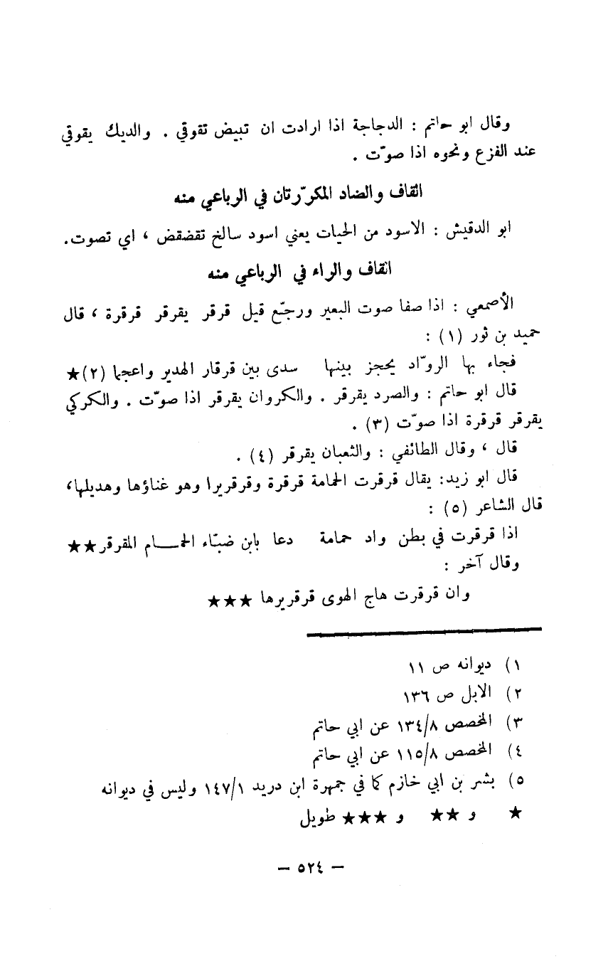 قال أبو حاتم: والصرد يقرقر. والكروان يقرقر إذا صوّت. والكركي يقرقر قرقرة إذا صوّت.