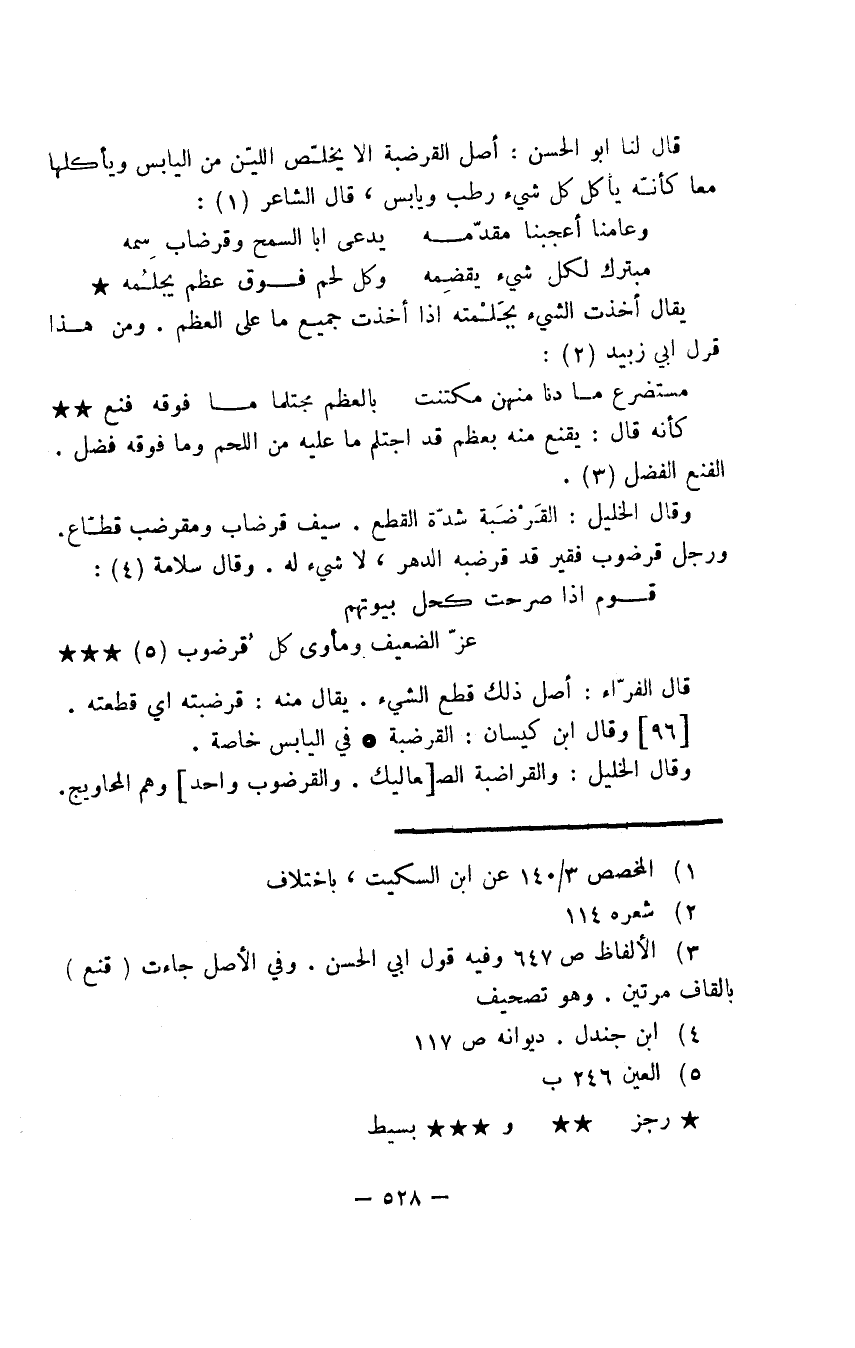 قال لنا أبو الحسن: أصل القرضبة ألا يخلّص الليّن من اليابس ويأكلها معا كأنّه يأكل كل شيء رطب ويابس، قال الشاعر: