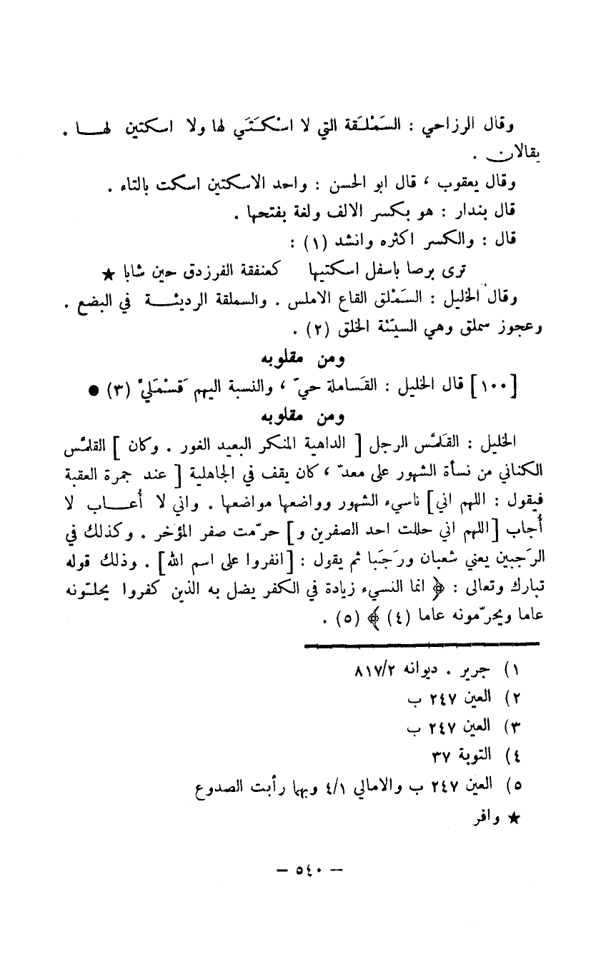 الخليل: القَلمّس الرجل الداهية المنكر البعيد الغور. وكان القلمّس الكناني من نسأة الشهور على معدّ، كان يقف في الجاهلية عند جمرة العقبة فيقول: اللهم إني ناسئ الشهور وواضعها مواضعها. وإني لا أُعاب لا أُجاب اللهم إني حللت أحد الصفرين وحرّمت صفر المؤخر. وكذلك في الرَّجبين يعني شعبان ورَجَبا ثم يقول: انفروا على اسم الله. وذلك قوله تبارك وتعالى: {إنما النسيء زيادة في الكفر يضل به الذين كفروا يحلّونه عاما ويحرّمونه عاما}.
