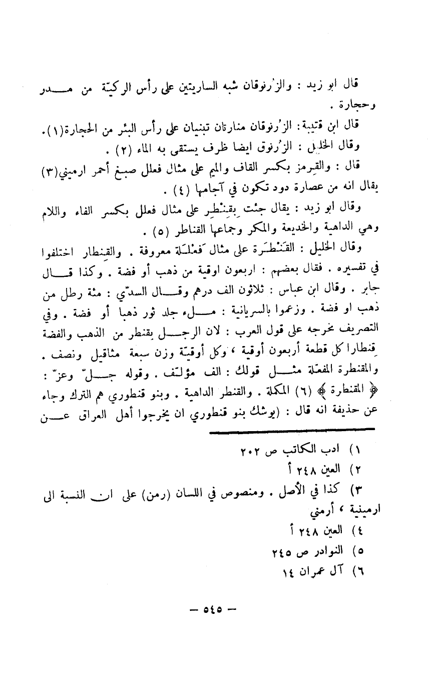 وقال الخليل: القَنْطَرة على مثال فَعْلَلة معروفة. والقِنطار اختلفوا في تفسيره. فقال بعضهم: أربعون أوقية من ذهب أو فضة. وكذا قال جابر. وقال ابن عباس: ثلاثون ألف درهم وقال السدّي: مئة رطل من ذهب أو فضة. وزعموا بالسريانية: ملء جلد ثور ذهبا أو فضة. وفي التصريف مخرجة على قول العرب: لأن الرجل يقنطر من الذهب والفضة قِنطارا كل قطعة أربعون أوقية، وكل أوقية وزن سبعة مثاقيل ونصف. والمقنطرة المفعلة مثل قولك: ألف مؤلّف، وقوله جلّ وعزّ: {المقنطرة} المكملة. والقنطر الداهية. وبنو قنطوري هم الترك وجاء عن حذيفة أنه قال: (يوشك بنو قنطوري أن يخرجوا أهل العراق عن