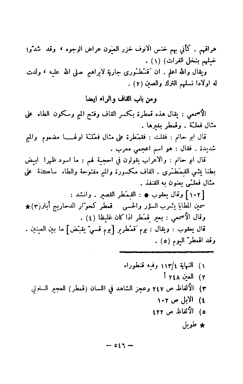 قال أبو حاتم: فقلت: فقمّطرة على مثال فعّلّة أولها مضموم والميم شديدة. فقال: هو اسم أعجمي معرب.