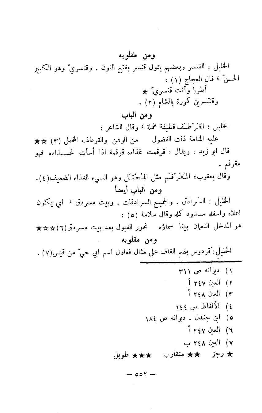 الخليل: القنسر وبعضهم يقول قنسر بفتح النون. وقنسريّ وهو الكبير الحسن، قال العجاج: