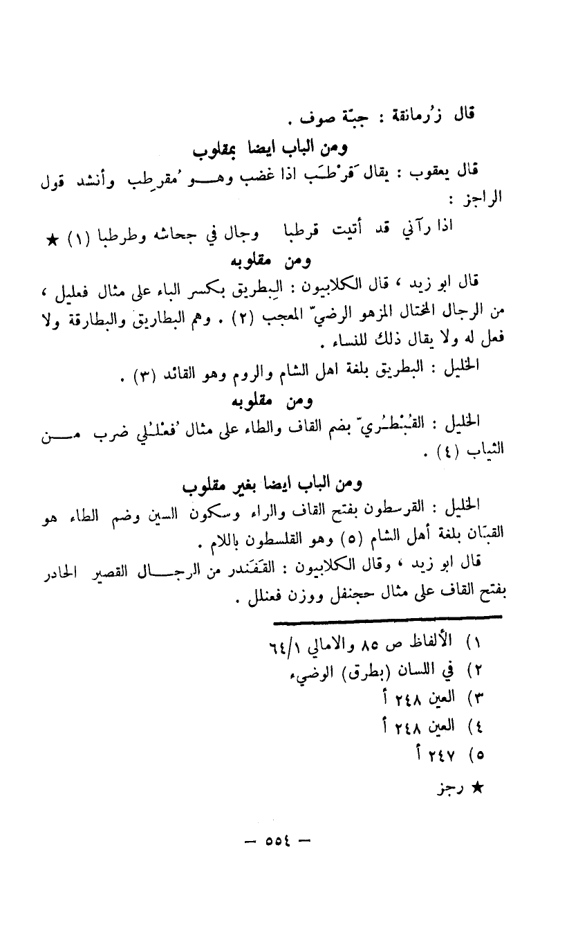 قال أبو زيد، قال الكلابيون: البِطريق بكسر الباء على مثال فعليل، من الرجال المختال المزهو الرضيّ المعجب. وهم البطاريق والبطارقة ولا فعل له ولا يقال ذلك للنساء.