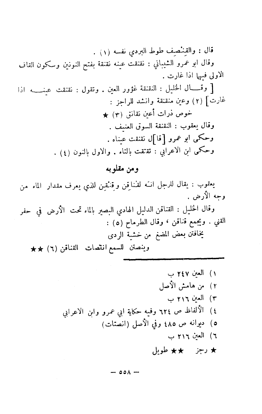 وقال الخليل: القناقن الدليل الهادي البصير بالماء تحت الأرض في حفر القني. ويجمع قناقن، وقال الطرماح: