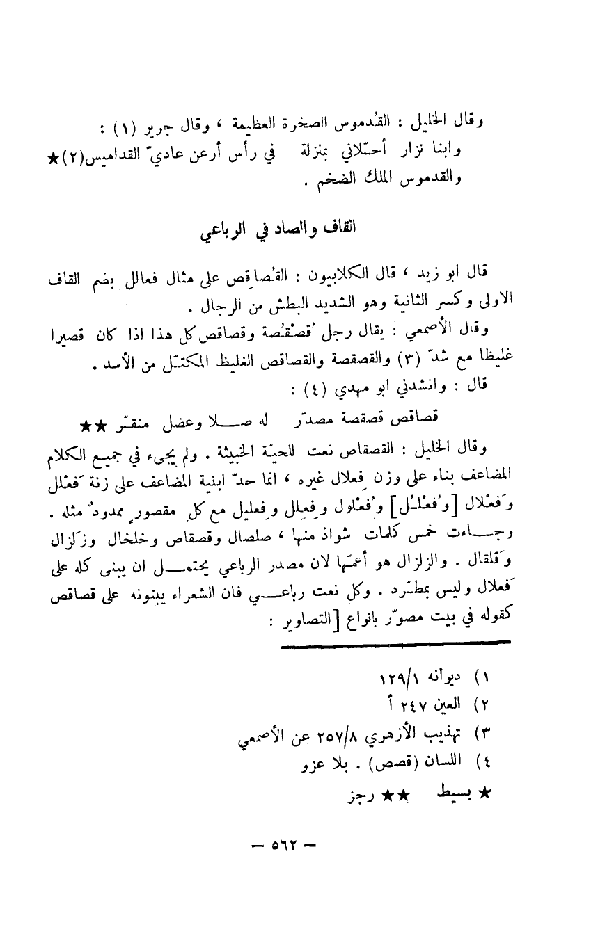 وقال الخليل: القصقاص نعت للحيّة الخبيثة. ولم يجئ في جميع الكلام المضاعف بناء على وزن فِعلال غيره، إنما حدّ أبنية المضاعف على زنة فَعْلل وفَعْلال وفُعْلُل وفُعْلول وفِعِلل وفِعليل مع كل مقصورٍ ممدودٌ مثله. وجاءت خمس كلمات شواذ منها، صلصال وقصقاص وخلخال وزَلزال وقَلقال. والزلزال هو أعمّها لأن مصدر الرباعي يحتمل أن يبنى كله على فَعلال وليس بمطّرد. وكل نعت رباعي فإن الشعراء يبنونه على قصاقص كقوله في بيت مصوّر بأنواع التصاوير: