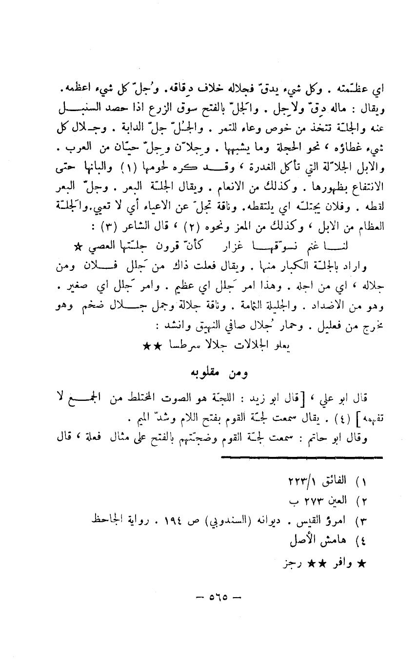 وأراد بالجلّة الكبار منها. ويقال فعلت ذاك من جَلل فلان ومن جلاله، أي من أجله. وهذا أمر جَلل أي عظيم. وأمر جَلل أي صغير. وهو من الأضداد. والجليلة الثمامة. وناقة جلالة وجمل جلال ضخم وهو مخرج من فعليل. وحمار جُلال صافي النهيق وأنشد: