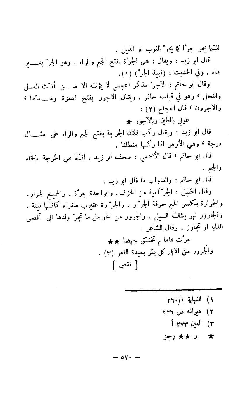 وقال الخليل: الجرّآنية من الخزف. والواحدة جرّة. والجميع الجرار. والجرارة بكسر الجيم حرفة الجرّار. والجرّارة عقيرب صفراء كأنّها تينة. والجارور نهر يشقّه السيل. والجرور من الحوامل ما تجرّ ولدها إلى أقصى الغاية أو تجاوز. وقال الشاعر: