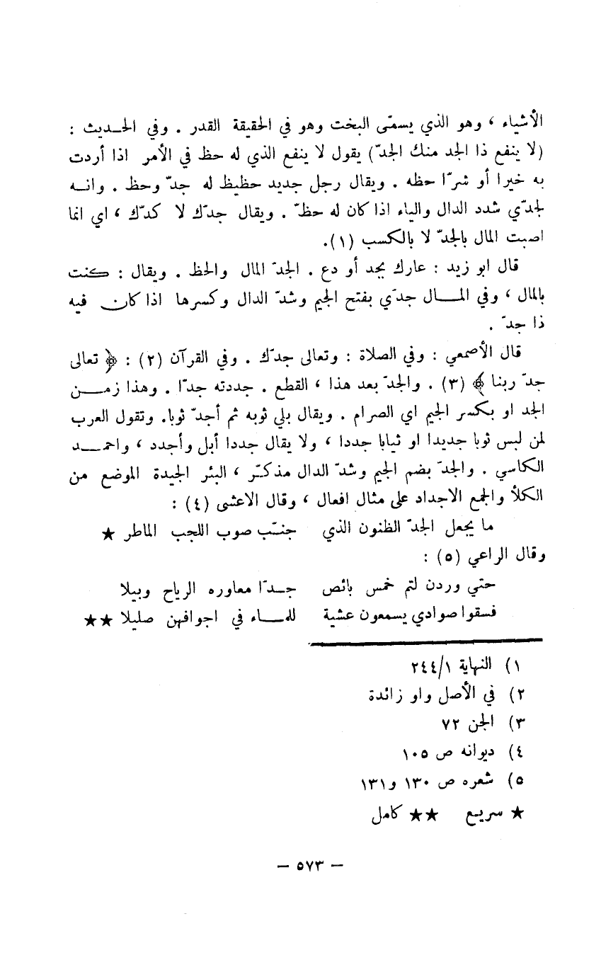 قال الأصمعي: وفي الصلاة: وتعالى جدّك. وفي القرآن: {تعالى جدّ ربنا}. والجدّ بعد هذا، القطع. جددته جدّا. وهذا زمن الجد أو بكسر الجيم أي الصرام. ويقال بلي ثوبه ثم أجدّ ثوبا. وتقول العرب لمن لبس ثوبا جديدا أو ثيابا جددا، ولا يقال جددا أبل وأجدد، واحمد الكاسي. والجدّ بضم الجيم وشدّ الدال مذكّر، البئر الجيدة الموضع من الكلأ والجمع الأجداد على مثال أفعال، وقال الأعشى: