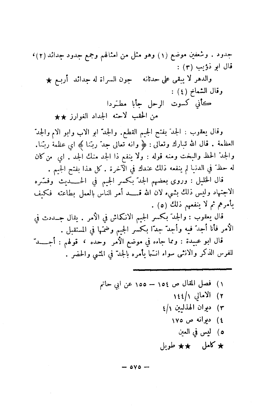 قال الخليل: وروى بعضهم الجدّ بكسر الجيم في الحديث وفسّره الاجتهاد وليس ذلك بشيء لأن الله قد أمر الناس بالعمل بطاعته فكيف يأمرهم ثم لا ينفعهم ذلك.