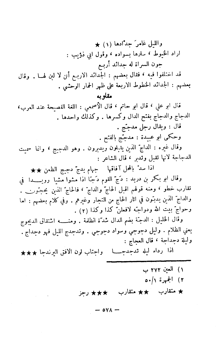 وقال أبو بكر بن دريد: دَجّ القوم دَجّا إذا مشو مشيا رويدا في تقارب خطو، ومنه قولهم أقبل الحاجّ والداجّ، فالحاجّ الذين يحجّون. والداجّ الذين يدبّون في آثار الحاج من التجار وغيرهم. وفي كلام بعضهم: أما وحواجّ بيت الله ودواجّه لأفعلن كذا وكذا.