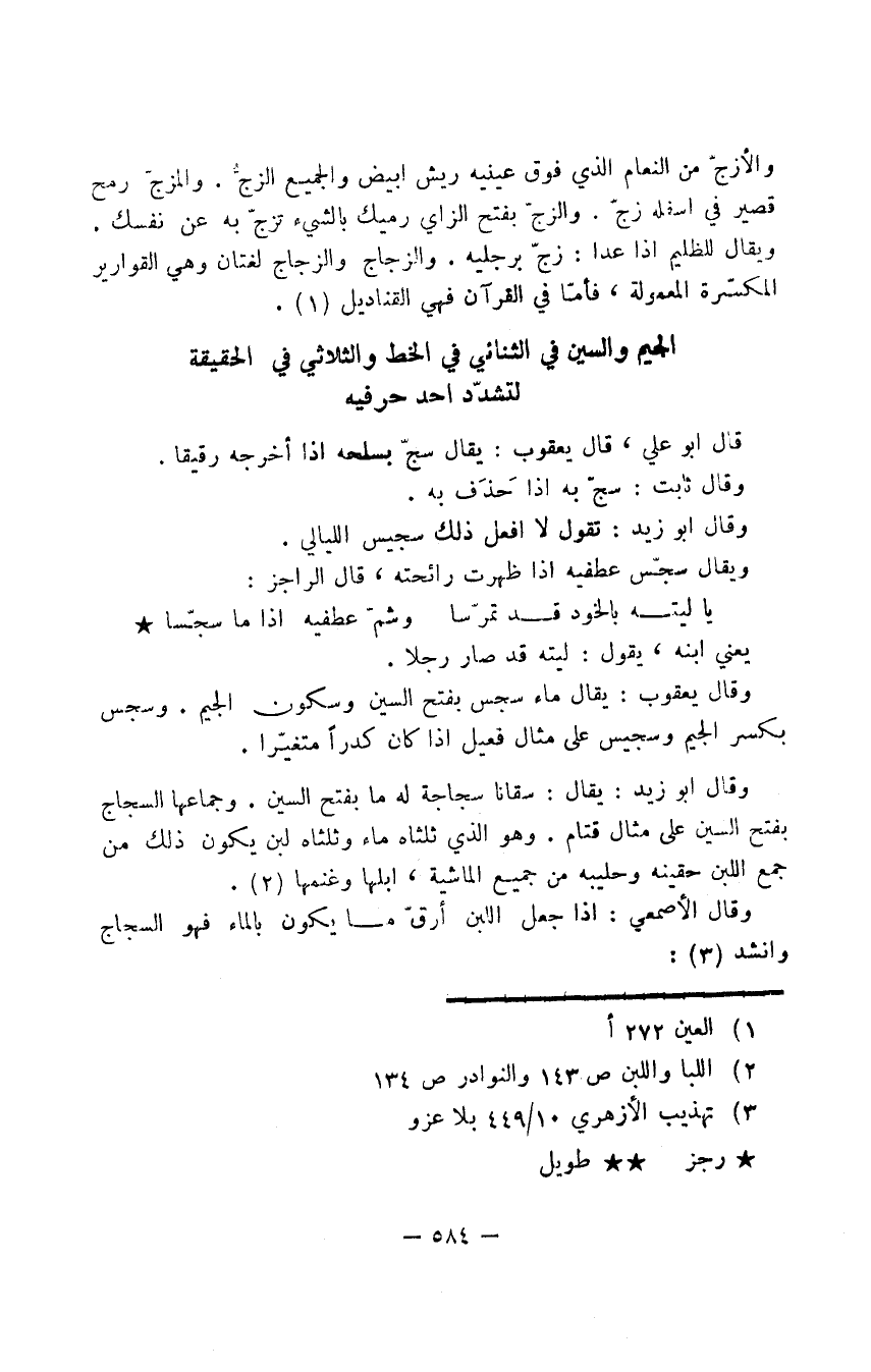 والأزجّ من النعام الذي فوق عينيه ريش أبيض والجميع الزجُّ. والمزجّ رمح قصير في أسفله زجّ. والزجّ بفتح الزاي رميك بالشيء تزجّ به عن نفسك. ويقال للظليم إذا عدا: زجّ برجليه. والزجاج والزجاج لغتان وهي القوارير المكسّرة المعمولة فأمّا في القرآن فهي القناديل.