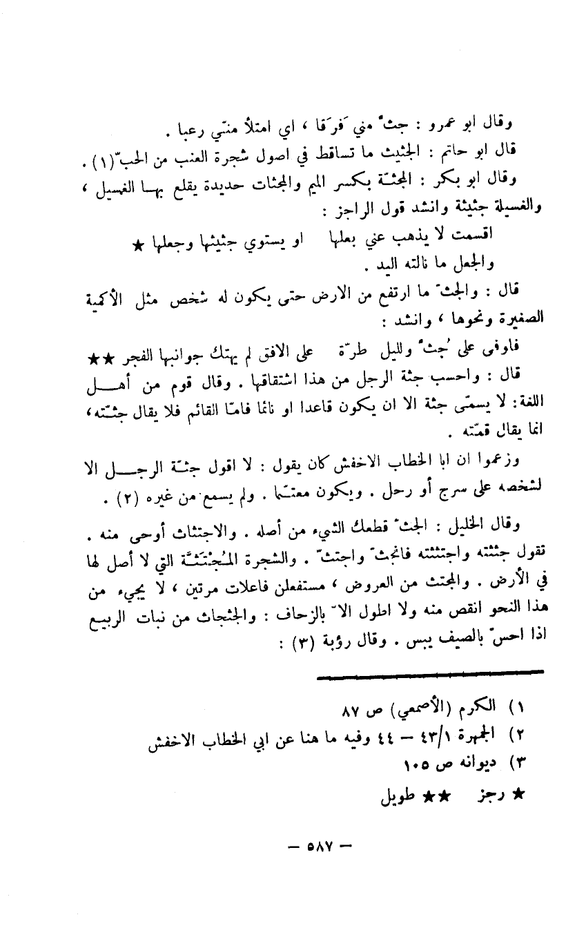 قال: والجثّ ما ارتفع من الأرض حتى يكون له شخص مثل الأكمية الصغيرة ونحوها، وأنشد: