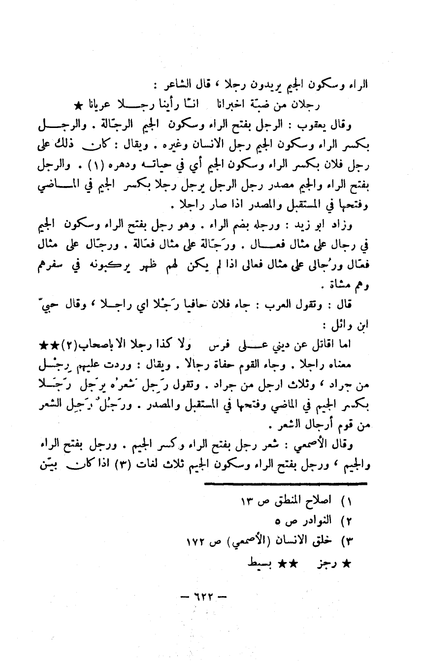 وزاد أبو زيد: ورجله بضم الراء. وهو رجل بفتح الراء وسكوت الجيم في رجال على مثال فعال. ورجّالة على مثال فعّالة. ورجّال على مثال فعّال ورُجالى على مثال فعالى إذا لم يكن لهم ظهر يركبونه في سفرهم وهم مشاة.