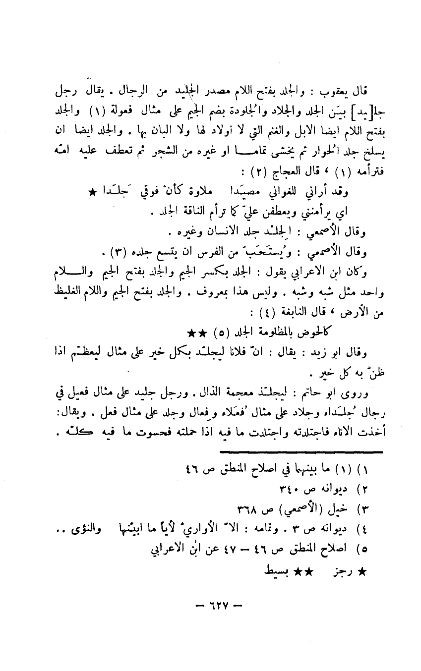 قال يعقوب: والجلد بفتح اللام مصدر الجليد من الرجال. يقال رجل جليد بيّن الجلد والجلاد والجُلودة بضم الجيم على مثال فعولة والجلد بفتح اللام أيضا الإبل والغنم التي لا أولاد لها ولا ألبان بها. والجلد أيضا أن يسلخ جلد الحُوار ثم يخشى تماما أو غيره من الشجر ثم تعطف عليه أمّه فترأمه، قال العجاج:
