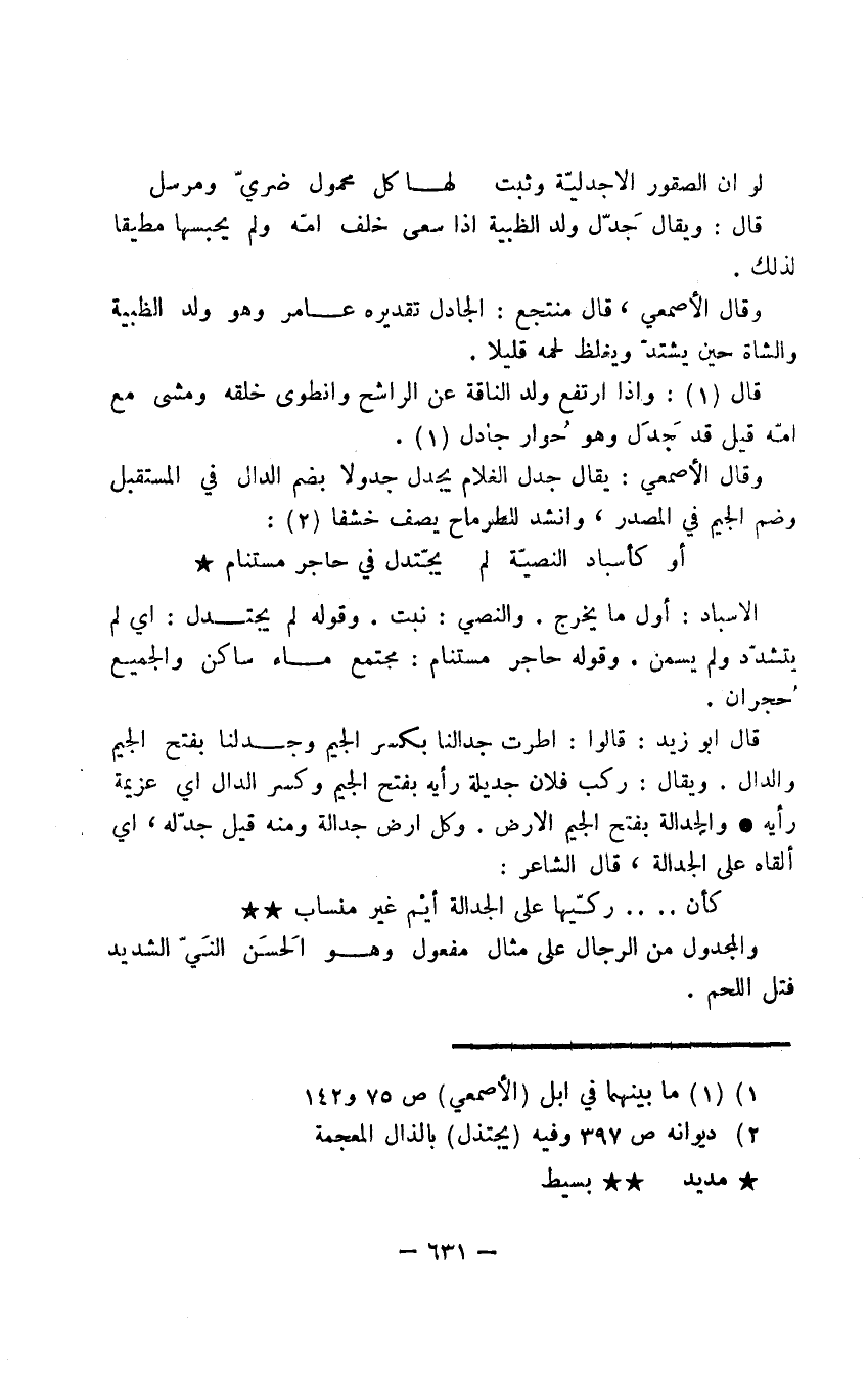 وقال الأصمعي، قال منتجع: الجادل تقديره عامر وهو ولد الظبية والشاة حين يشتدّ ويغلظ لحمه قليلا.
