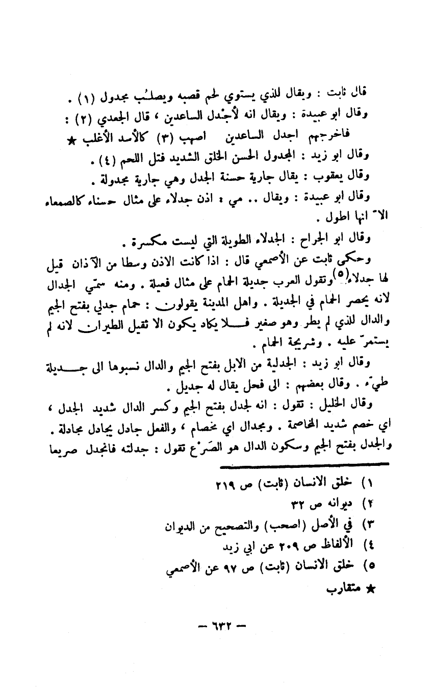 وحكى ثابت عن الأصمعي قال: إذا كانت الأذن وسطا من الآذان قيل لها جدلاء وتقول العرب جديلة الحمام على مثال فعيلة. ومنه سمي الجدال لأنه يحصر الحمام في الجديلة. وأهل المدينة يقولون: حمام جدلي بفتح الجيم والدال للذي لم يطر وهو صغير فلا يكاد يكون إلا ثقيل الطيران لأنه يستمرّ عليه. وشريجة الحمام.