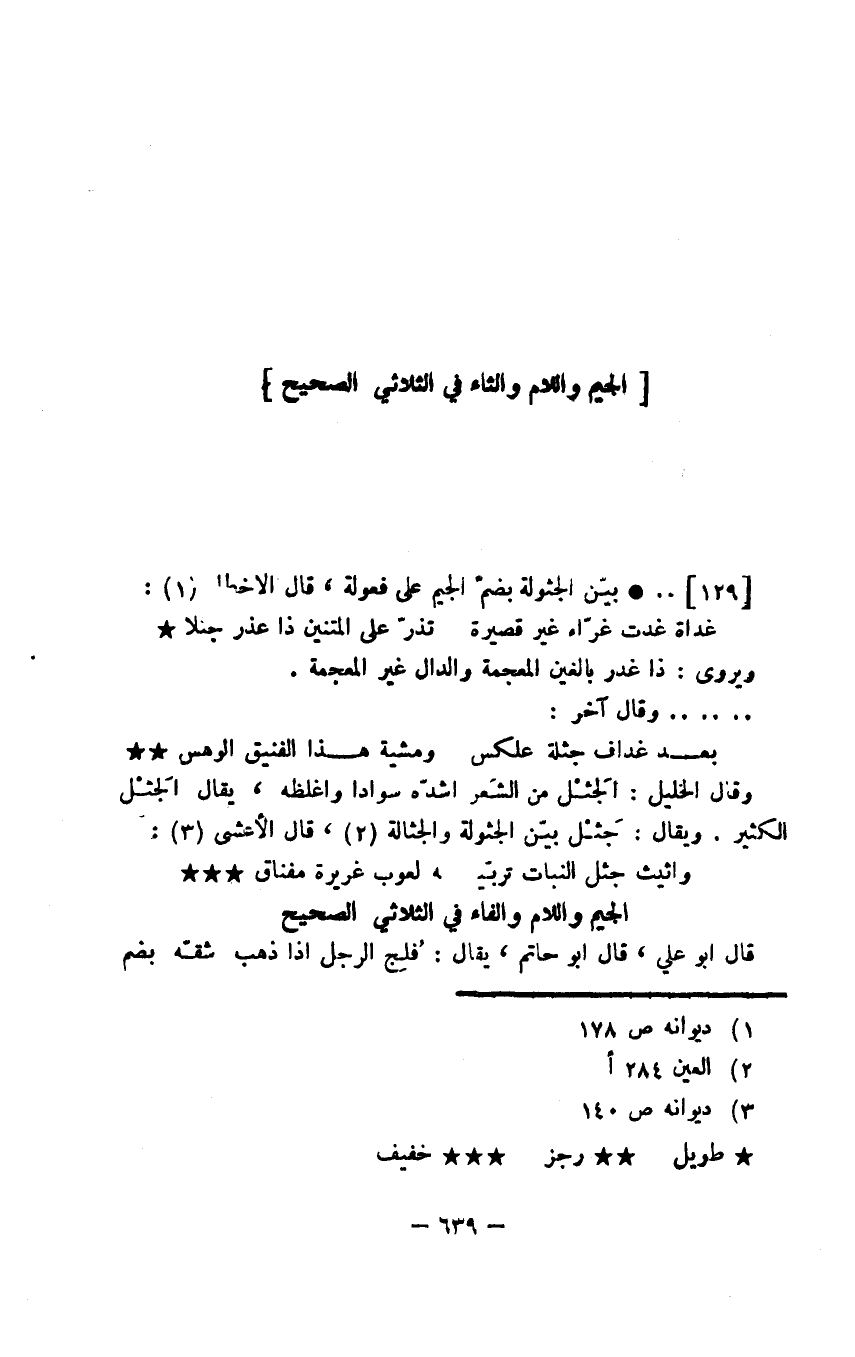 وقال الخليل: الجَثْل من الشَّعر أشدّه سوادا وأغلطه، يقال الجَثْل الكثير. ويقال: جَثْل بيّن الجثولة والجثالة، قال الأعشي: