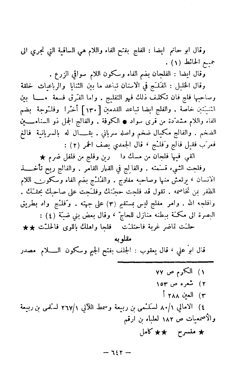 وقال الخليل: الفَلَج في الأسنان تباعد ما بين الثنايا والرباعيات خلقة وصاحبها فلج فإن تكلف ذلك فهو التفليج. وأما الفَرق فسعة ما بين الثنيّتين خاصة. والفلج أيضا تباعد القدمين أخرا وفلّوجه بضم الفاء واللام مشدّدة من قرى سواد الكوفة. والفالج الجمل ذو السنامين الضخم. والفالج مكيال ضخم وأصله سرياني. يقال له بالسريانية فالغ فعرّب فقيل فالج وفَلْج، قال الجعدي يصف الخمر: