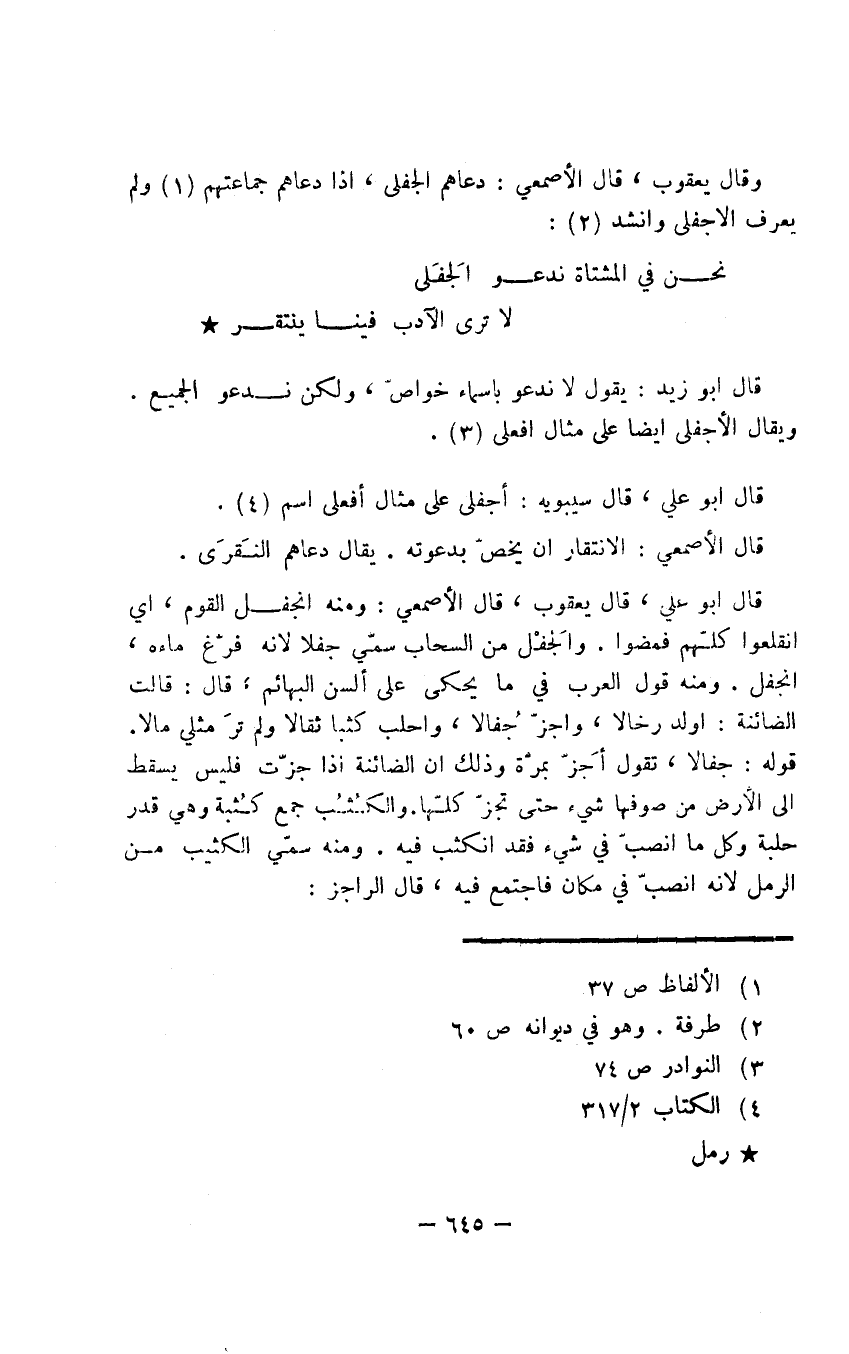 قال أبو علي، قال يعقوب، قال الأصمعي: ومنه انجفل القوم، أي انقلعوا كلّهم فمضوا. والجَفْل من السحاب سمّي جفلا لأنه فرّغ ماءه، انجفل. ومنه قول العرب في ما يحكى على ألسن البهائم، قال: قالت الضائنة: أولد رخالا، وأجزّ جُفالا، وأحلب كثبا ثقالا ولم ترَ مثلي مالا. قوله: جفالا، تقول أجَزّ بمرّة وذلك أن الضائنة إذا جزّت فليس يسقط إلى الأرض من صوفها شيء حتى تجزّ كلّها. والكُثُب جمع كُثبة وهي قدر حلبة وكل ما انصبّ في شيء فقد انكثب فيه. ومنه سمّي الكثيب من الرمل لأنه انصبّ في مكان فاجتمع فيه، قال الراجز: