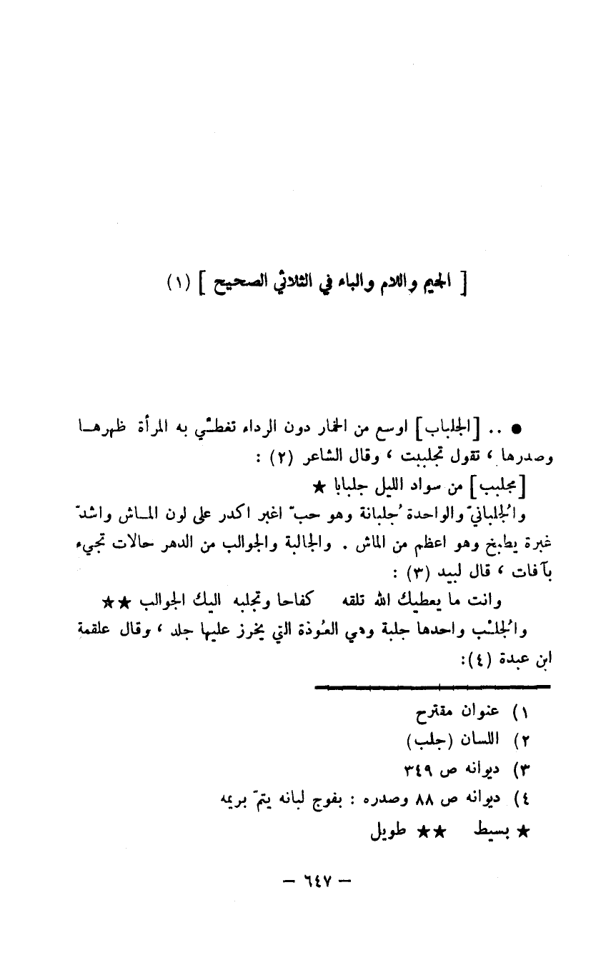 الجلباب أوسع من الخمار دون الرداء تغطّي به المرأة ظهرها وصدرها، تقول تجلببت، وقال الشاعر: