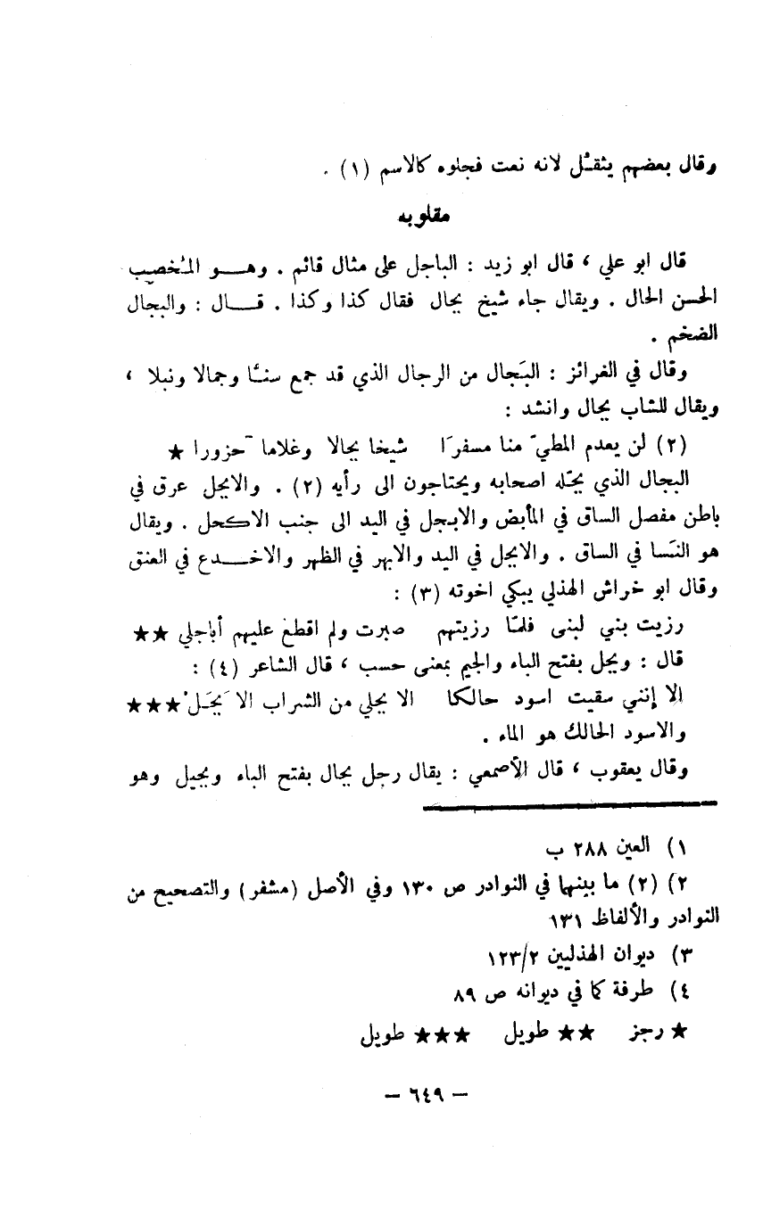 قال أبو علي، قال أبو زيد: الباجل على مثال قائم. وهو المُخصِب الحسن الحال. ويقال جاء شيخ بجال فقال كذا وكذا. قال: والبجال الضخم.