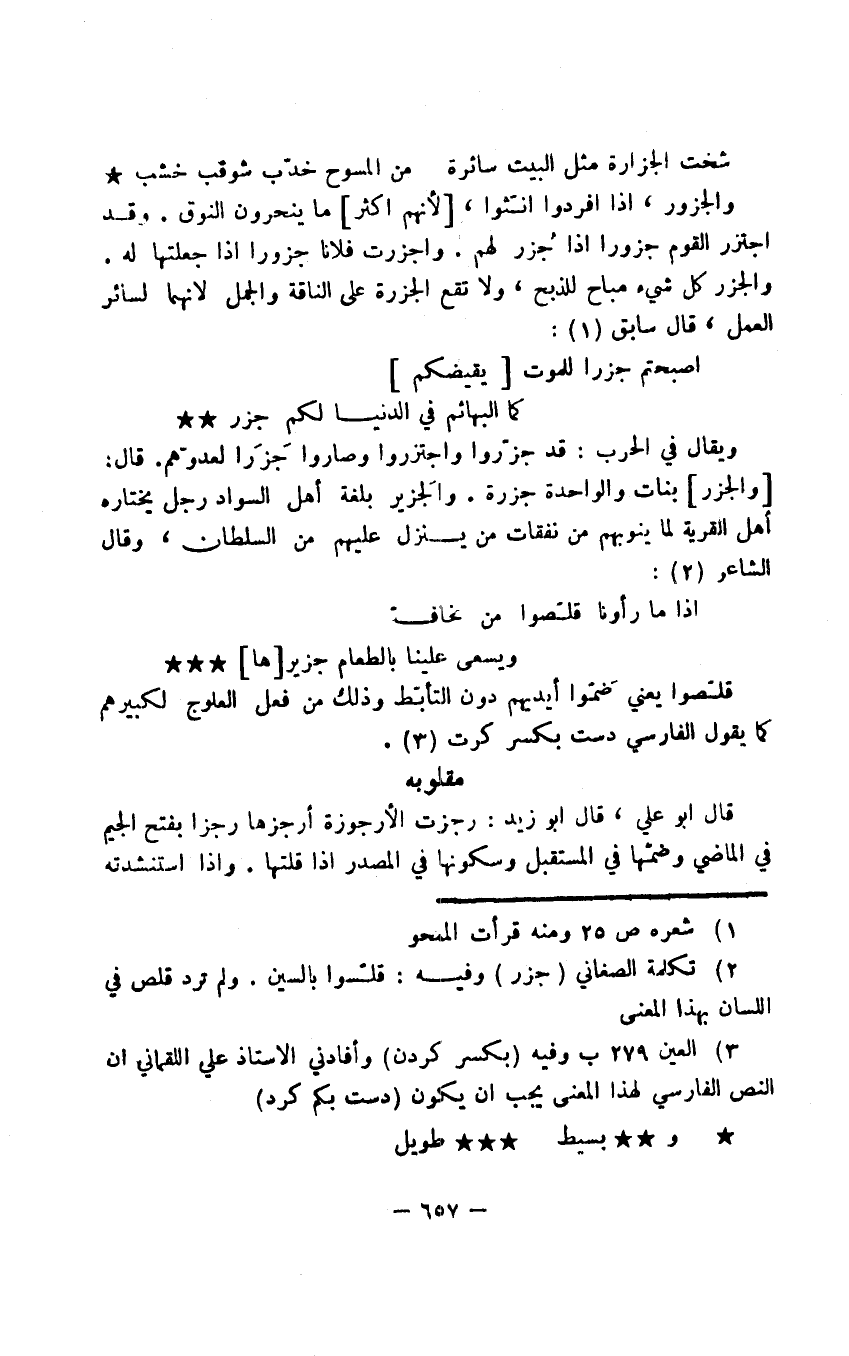 ويقال في الحرب: قد جزّروا واجتزروا وصاروا جَزَرا لعدوّهم. قال: والجزر بنات والواحدة جزرة. والجَزير بلغة أهل السواد رجل يختاره أهل القرية لما ينوبهم من نفقات من ينزل عليهم من السلطان، وقال الشاعر: