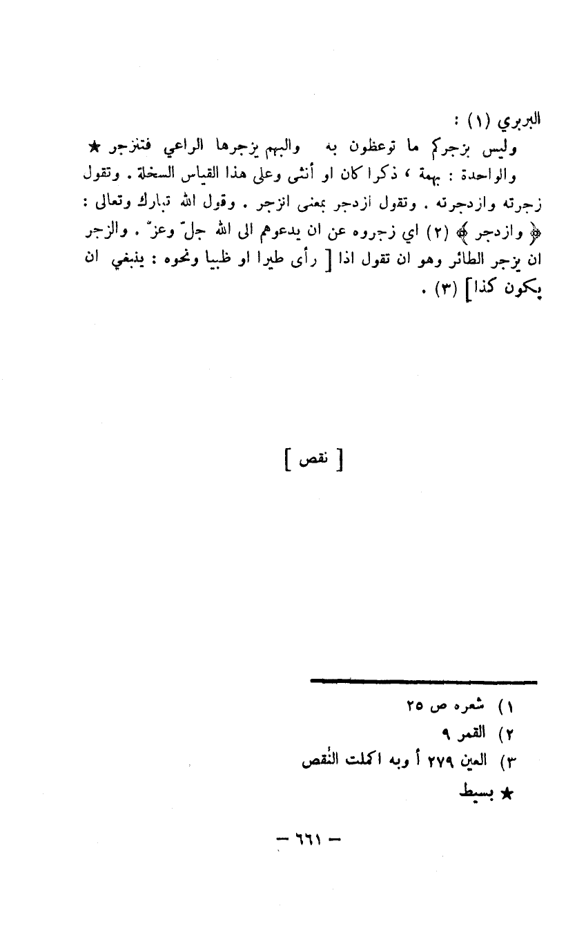 والواحدة: بهمة، ذكرا كان أو أنثى وعلى هذا القياس السخلة. وتقول زجرته وازدجرته. وتقول ازدجر بمعنى انزجر. وقول الله تبارك وتعالى: {وازدجر} أي زجروه عن أن يدعوهم إلى الله جلّ وعزّ. والزجر أن يزجر الطائر وهو أن تقول إذا رأى طيرا أو ظبيا ونحوه: ينبغي أن يكون كذا.