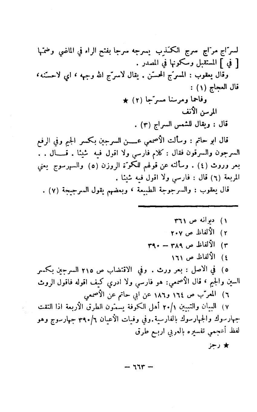 قال أبو حاتم: وسألت الأصمعي عن السرجين بكسر الجيم وفي الرفع السرجون والسرقون فقال: كلام فارسي ولا أقول فيه شيئا. قال .. بعر وروث. وسألته عن قولهم للكوّة الروزن والسهرسوج يعني المربعة قال: فارسي ولا أقول فيه شيئا.