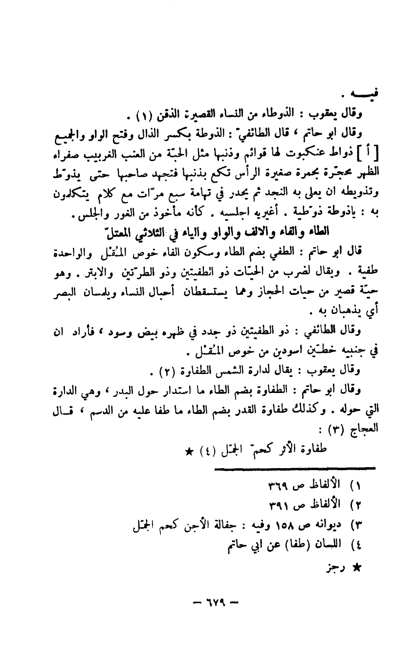 قال أبو حاتم: الطفي بضم الطاء وسكون الفاء خوص المُقْل والواحدة طفية. ويقال لضرب من الحيّات ذو الطفيتين وذو الطرّتين والأبتر. وهو حيّة قصير من حيات الحجاز وهما يستسقطان أحبال النساء ويلمسان البصر أي يذهبان به.