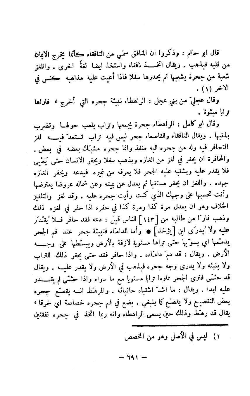 قال أبو حاتم: وذكروا أن المنافق سمّى من النافقاء كأنما يخرج الإيمان من قلبه فيذهب. ويقال اتخذ نافقاء واستخذ أيضا لغة أخرى. واللغز شعبة من جحرة يشعبها ثم يحدرها سفلا فإذا أعيت عليه مذاهبه كنس في الآخر.