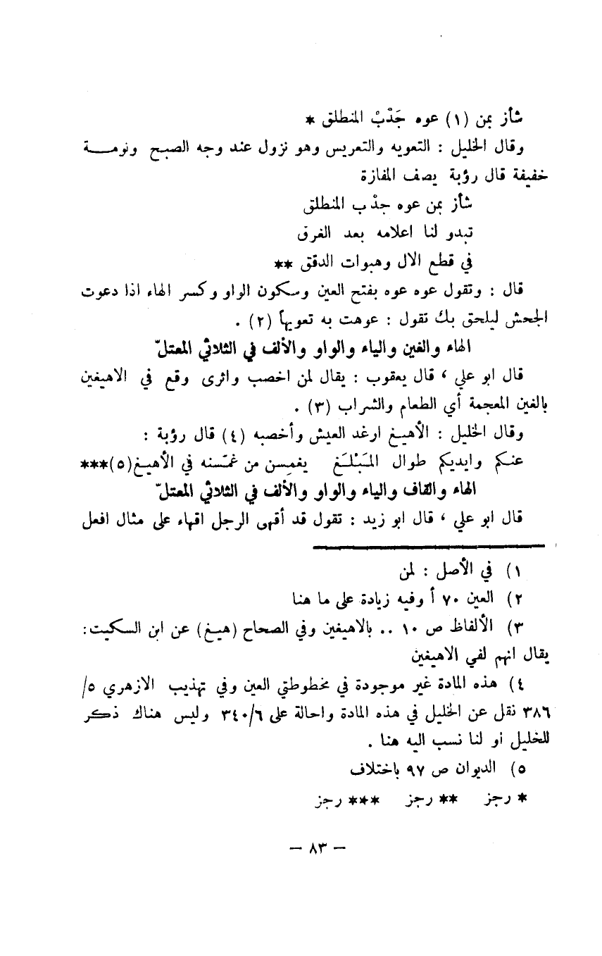 قال: وتقول عوه عوه بفتح العين وسكون الواو وكسر الهاء إذا دعوت الجحش ليلحق بك تقول: عوهت به تعويها.