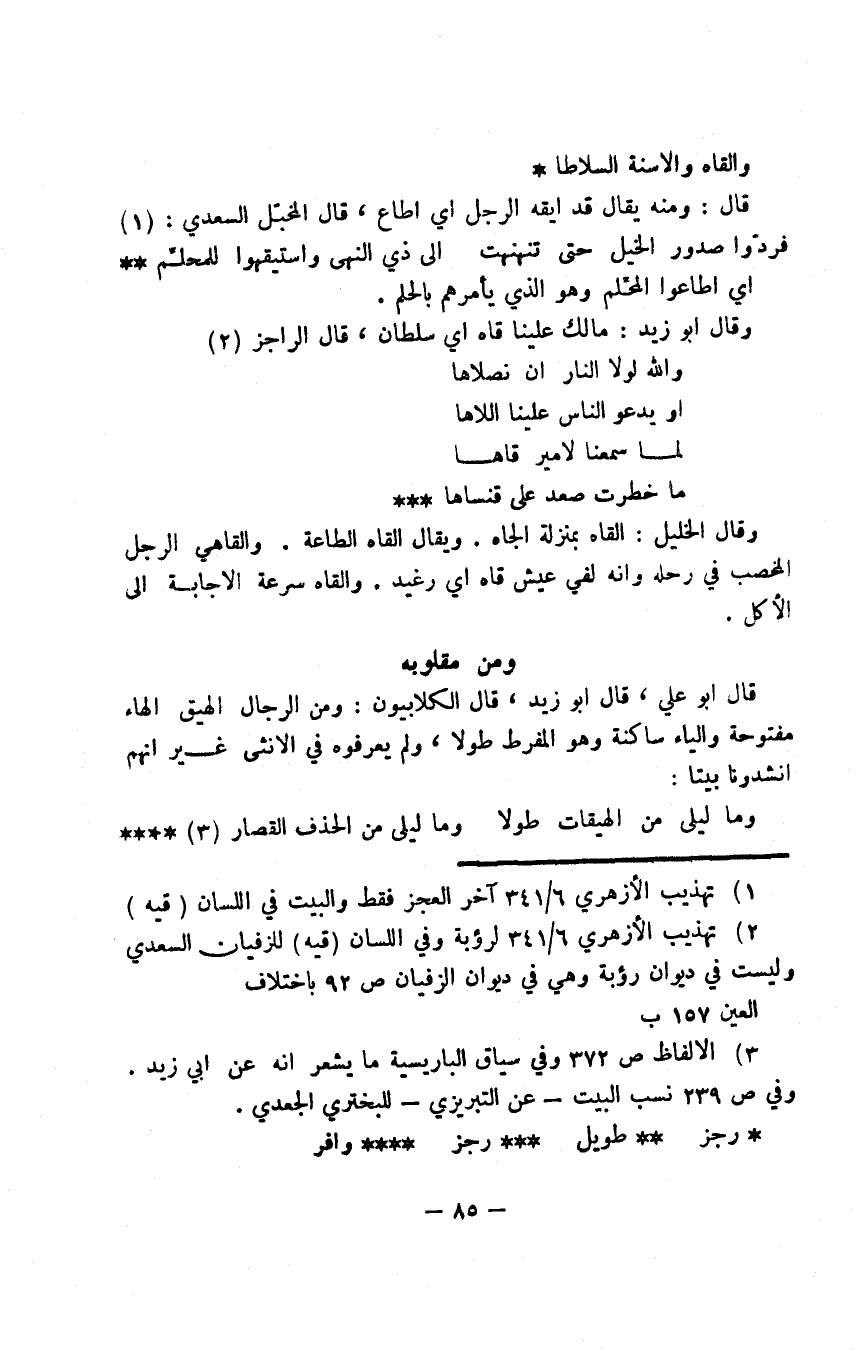 وقال أبو زيد: ما لك علينا قاه أي سلطان، قال الراجز: