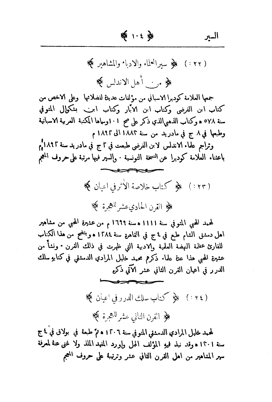لمحمد خليل المرادي الدمشقيي المتوفى سنة 1206هـ ثم طبعه في بولاق في 4ج سنة 1301هـ وقد نبذ فيه المؤلف الملل واورد المفيد الملذ ولا غنى عنه لمعرفة سير المشاهير من اهل القرن الثاني عشر وترتيبه على حروف المعجم.