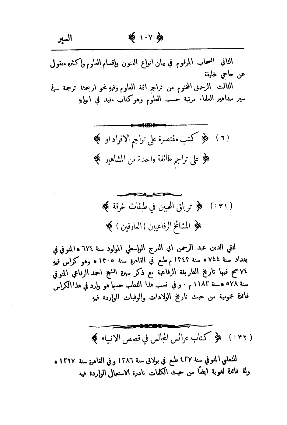 لتقي الدين عبد الرحمن ابي الفرج الواسطي المولود سنة 674هـ المتوفى في بغداد سنة 744هـ سنة 1343م طبع في القاهرة سنة 1305هـ وهو كراس فيه 74صح فيها تاريخ الطريقة الرافعية مع ذكر سيرة الشيخ أحمد الرفاعي المتوفى سنة 578هـ سنة 1182م. وفي نسب هذا القطب حسبما هو وارد في هذا الكراس فائدة عمومية من حيث تاريخ الولادات والوفيات الواردة فيه