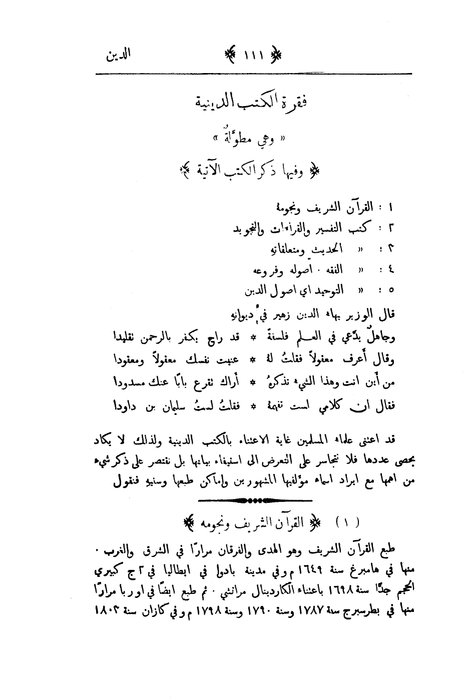 وهي مطولة وفيها ذكر الكتب الآتية القرآن الشريف ونجومه كتب التفسير والقراءات والتجويد كتب الحديث ومتعلقاته كتب الفقه. اصوله وفروعه كتب التوحيد أي اصول الدين قال الوزير بهاء الدين زهير في ديوانه