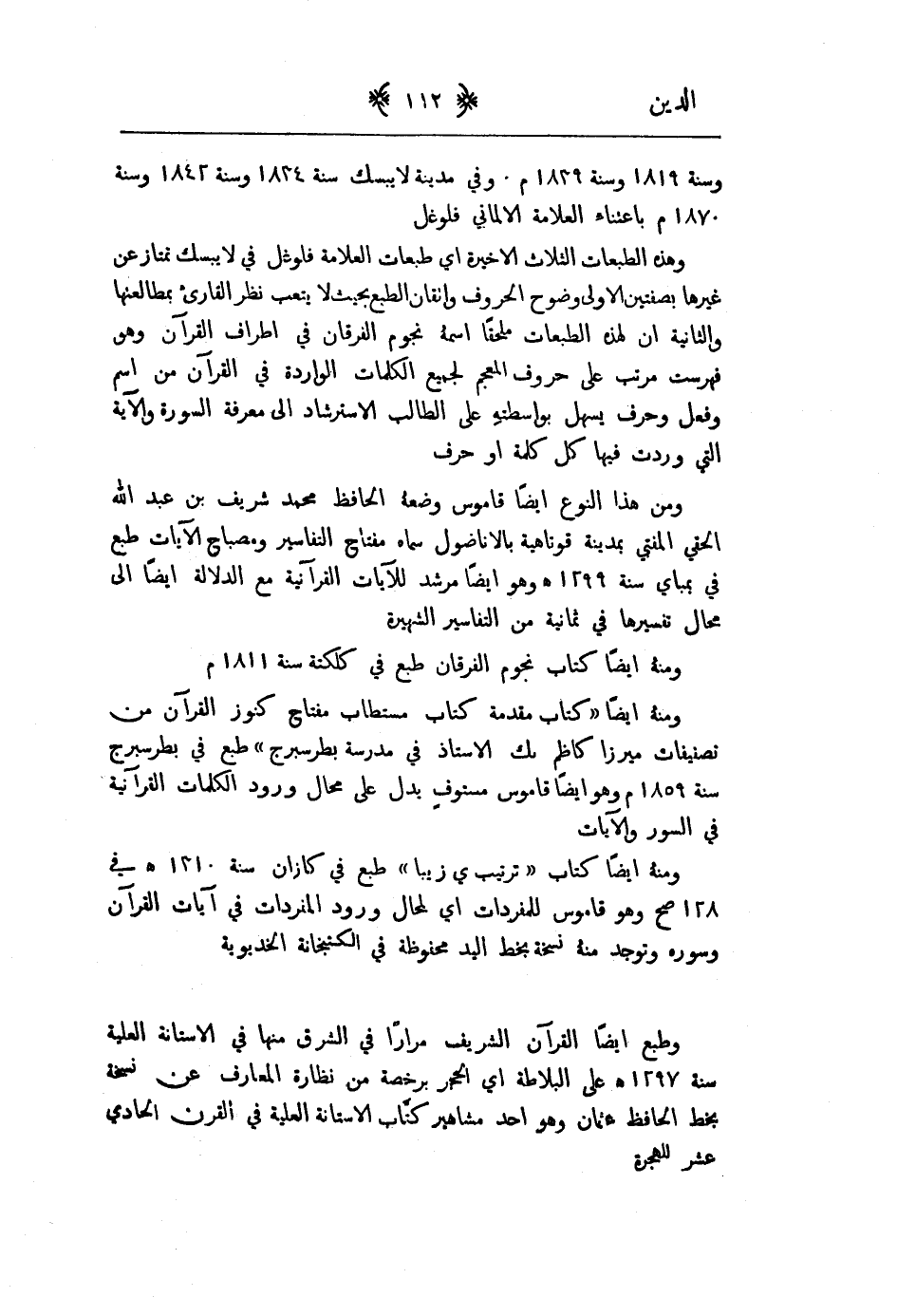 وسنة 1819وسنة 1839م. وفي مدينة لايبسك سنة 1834 وسنة 1842 وسنة 1870م باعتناء العلامة الالماني فلوعل وهذه الطبعات الثلاث الاخيرة أي طبعات العلامة فلوغل في لايبسك تمتاز عن غيرها صفتين الاولى وضوح الحروف واتقان الطبع بحيث لا يتعب نظر القارئ بمطالعتها والثانية إن لهذه الطبعات ملحقا اسمه الفرقان في اطراف القرآن وهو فهرست مرتب على حروف المعجم لجميع الكلمات الواردة في القرآن من اسم وفعل وحرف يسهل بواسطته على الطالب الاسترشاد الى معرفة السور والآية التي وردت فيها كل كلمة او حرف ومن هذا النوع ايضاً قاموس وضعه الحافظ محمد شريف بن عبد الله الحقي المفتي بمدينة قوتاهيه بالاناضول سماه مفتاح التفاسير ومصباح الآيات طبع في بمباي سنة 1299هـ وهو ايضاً مرشد للآيات القرآنية مع الدلالة ايضاً الى محال تفسيرها في ثمانية من التفاسير الشهيرة ومنه ايضاً كتاب نجوم الفرقان طبع في كلكته سنة 1811م ومنه ايضاً " كتاب مقدمة كتاب مستطاب مفتاح كنوز القرآن من تصنيفات ميرزا كاظم بك الاستاذ في مدرسة بطرسبرج " طبع في بطرسبرج سنة 1859م وهو ايضاً قاموس مستوفي يدل على مجال ورود الكلمات القرآنية في السور والآيات ومنه ايضاً كتاب " ترتيب ي زيبا " طبع في كازان سنة 1310هـ في 128صح وهو قاموس للمفردات أي لمحال ورود المفردات في آيات القرآن وسوره وتوجد منه نسخة بخط اليد محفوظة في الكتب خانة الخديوية وطبع ايضاً القرآن الشريف مرارا في الشرق منها في الاستانة العلية سنة 1297هـ على البلاط أي الحجر برخصة من نظارة المعارف عن نسخة بخط الحافظ عثمان وهو من مشاهير كتاب الاستانة في القرن الحادي عشر للهجرة