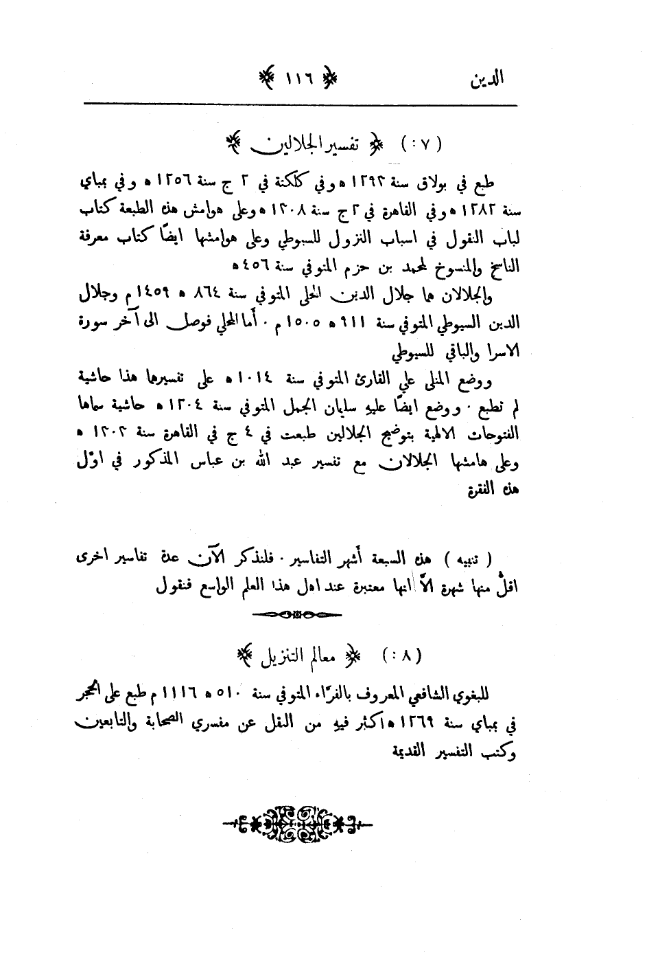 للبغوي الشافعي المعروف بالفراء المتوفى سنة 510هـ 1116م طبع على الحجر سنة 1269هـ اكثر فيه من النقل عن فسري الصحابة والتابعين وكتب التفسير القديمة.
