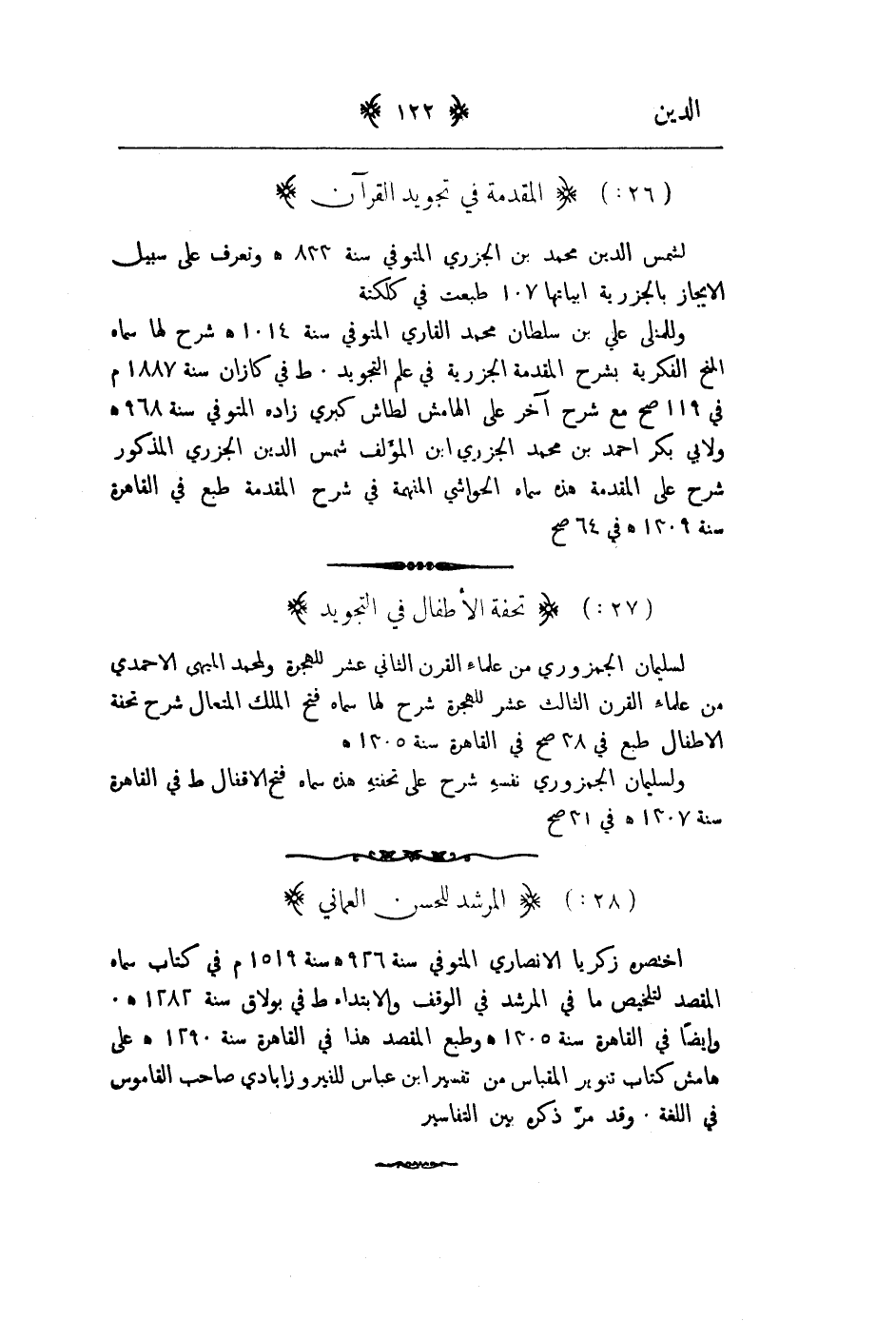 لشمس الدين محمد بن الخزري المتوفى سنة 833هـ وتعرف على سبيل الايجاز بالجزرية ابياتها 107 طبعت في كلكته.