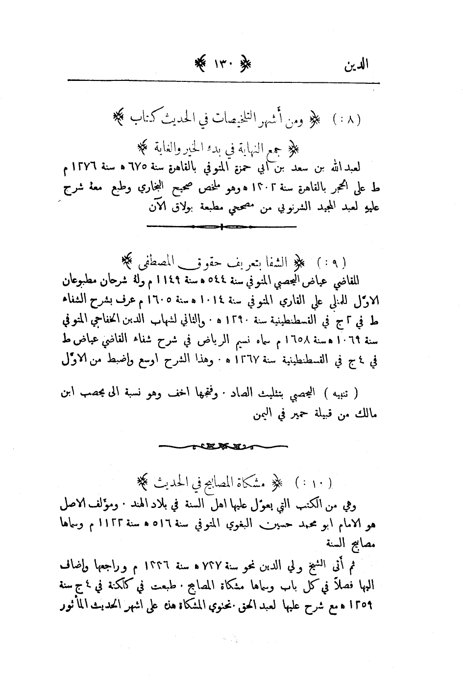 ثم اتى الشيخ ولي الدين نحو سنة 737هـ 1336م وراجعها واضاف اليها فصلا في كل باب وسمها مشكاة المصابيح. طبعت في كلكته في 4ج سنة 1259هـ مع شرح عليها لعبد الحق. تحتوي المشكاة هذه على اشهر الحديث المأثور