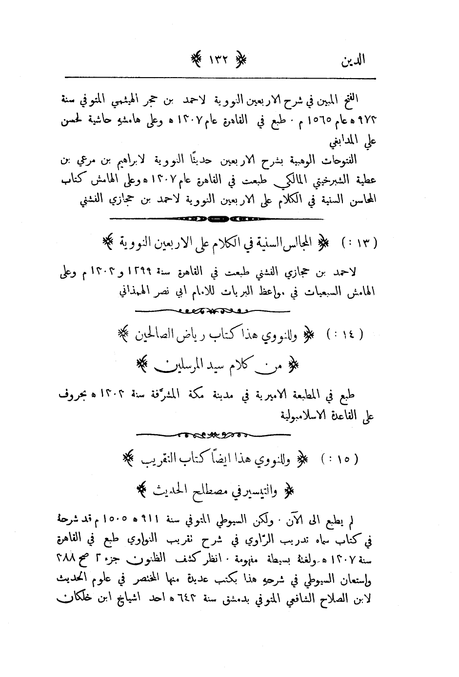 الفتح المبين في شرح الاربعين النووي لأحمد بن حجر الهيثمي المتوفى سنة 973هـ 1565م. طبع في القاهرة عام 1307هـ وعلى هامشه حاشية لحسن علي المدابغي.