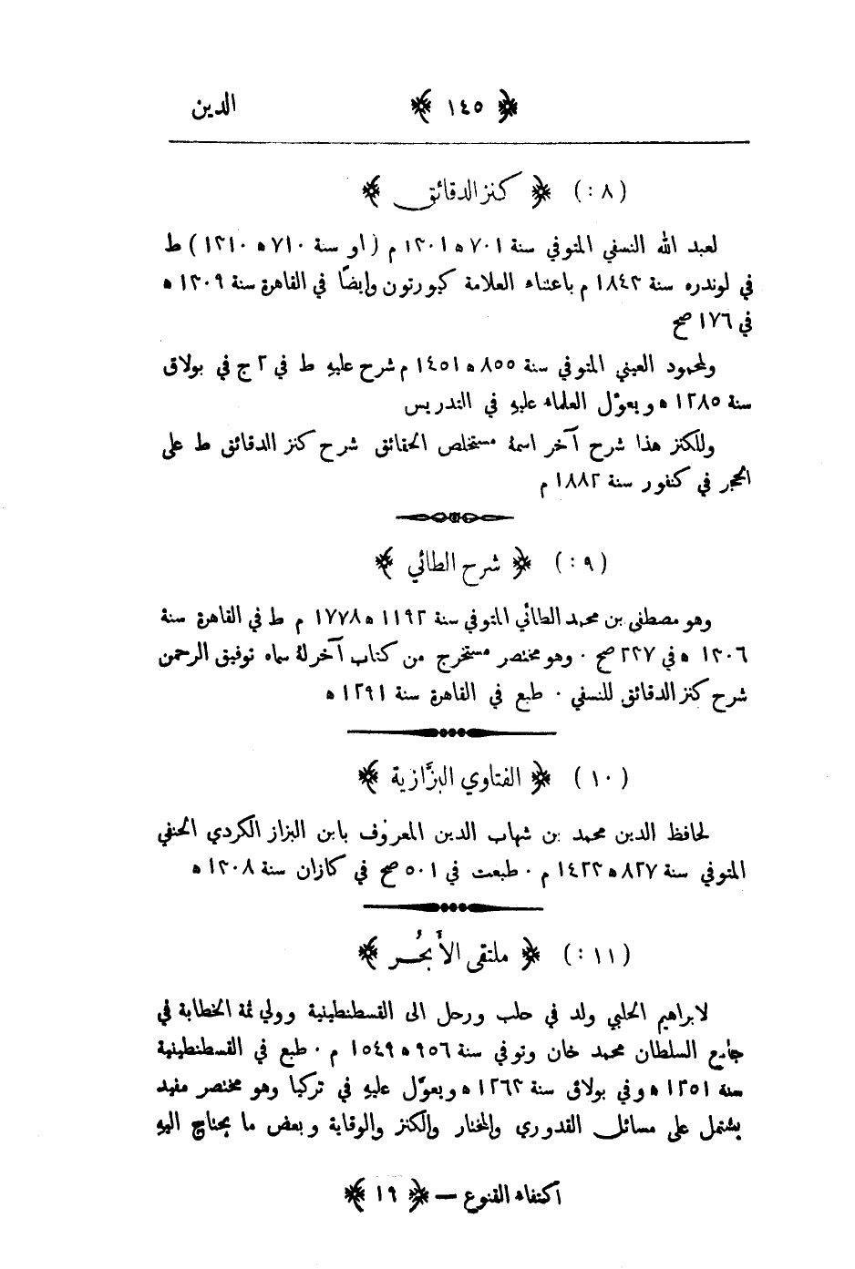 لعبد الله النسفي المتوفى سنة 701هـ 1301م " او سنة 710هـ 1310م " طبع في لوندره سنة 1843م باعتناء العلامة كبورتون وايضاً في القاهرة سنة 1309هـ في 176 صح ولمحمود العيني المتوفى سنة 855هـ 1451م شرح عليه طبع في 2ج في بولاق سنة 1285 هـ ويعول العلماء علية في التدريس وللكنز هذا شرح آخر اسمه مستخلص الحقائق شرح كنز الدقائق طبع على الحجر في كنفور سنة 1882م
