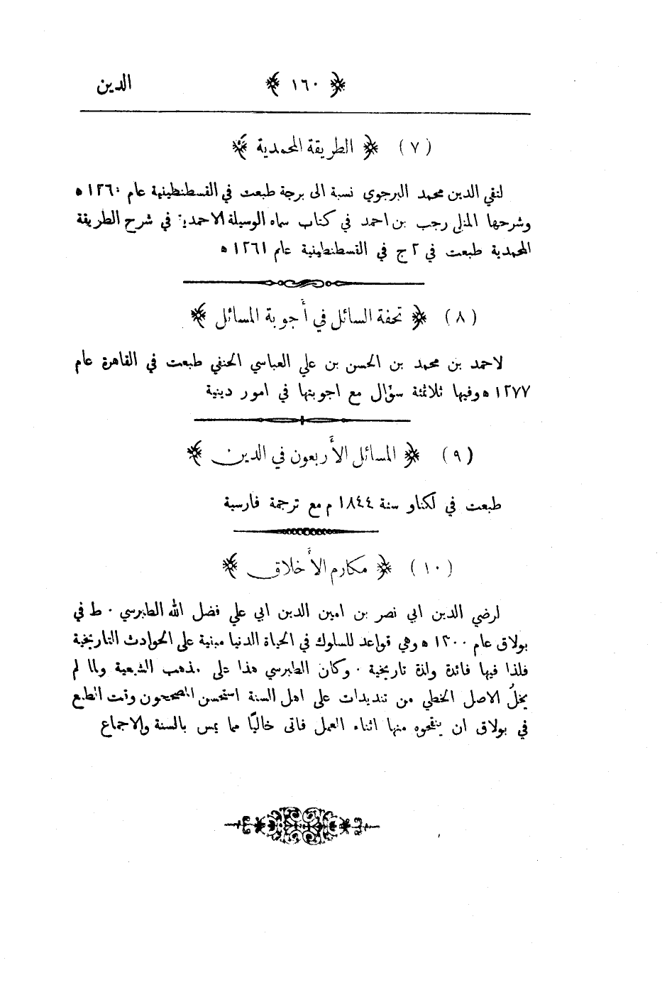 لتقي الدين محمد البرجوي نسبة الى برجة طبعت في القسطنطينية عام 1260هـ وشرحها المنلي رجب بن أحمد في كتاب سماه الوسيلة الأحمدية في شرح الطريقة المحمدية طبعت في 2ج في القسطنطينية عام 1261هـ