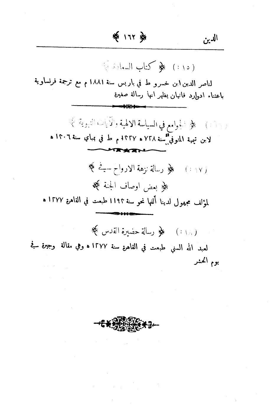 لعبد الله السني طبعت في القاهرة سنة 1279هـ وهي مقالة وجيزة في يوم الحشر