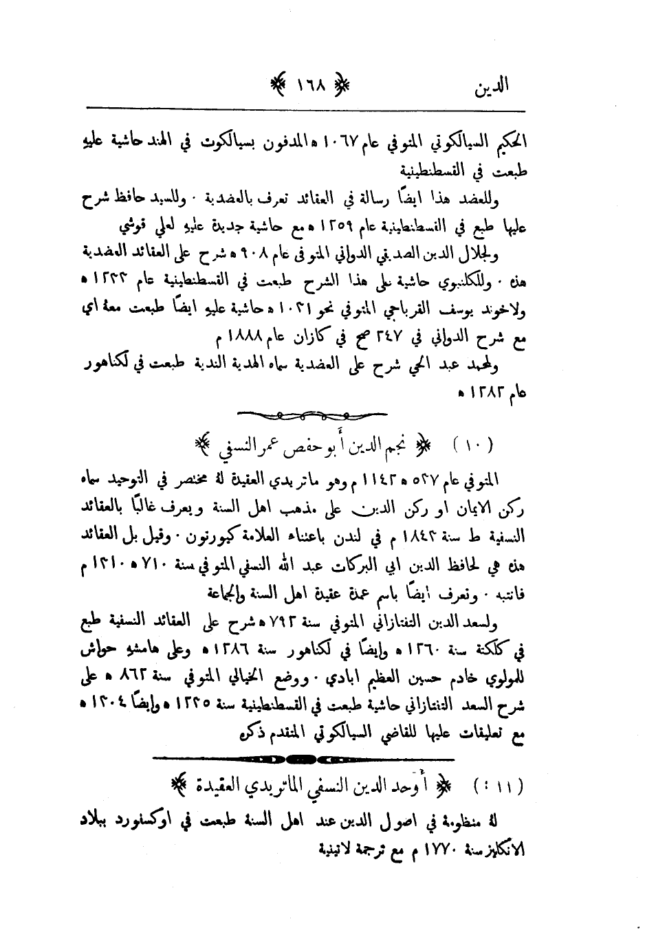 المتوفى عام 537هـ 1142م وهو ماتريدي العقيدة له مختصر في التوحيد سماه ركن الايمان او ركن الدين على مذهب اهل السنة ويعرف غالباً بالعقائد النسفية طبع سنة 1843م في لندن باعتناء العلامة كبورتون. وقيل بل العقائد هذه هي لحافظ الدين ابي البركات عبد الله النسفي المتوفى سنة 710هـ 1310م فانتبه. وتعرف ايضاً باسم عمدة عقيدة اهل السنة والجماعة ولسعد الدين التفتازاني المتوفى سنة 792هـ شرح على العقائد النسفية طبع في كلكته سنة 1260 هـ وايضاً في لكناهور سنة 1286هـ وعلى هامشه حواش للمولوي خادم حسين العظيم ابادي. ووضع الخيالي المتوفى سنة 862هـ على شرح السعد التنتازاني حاشية طبعت في القسطنطينية سنة 1235هـ وايضاً 1304هـ وع تعليقات عليها للقاضي السيالكوتي المتقدم ذكره